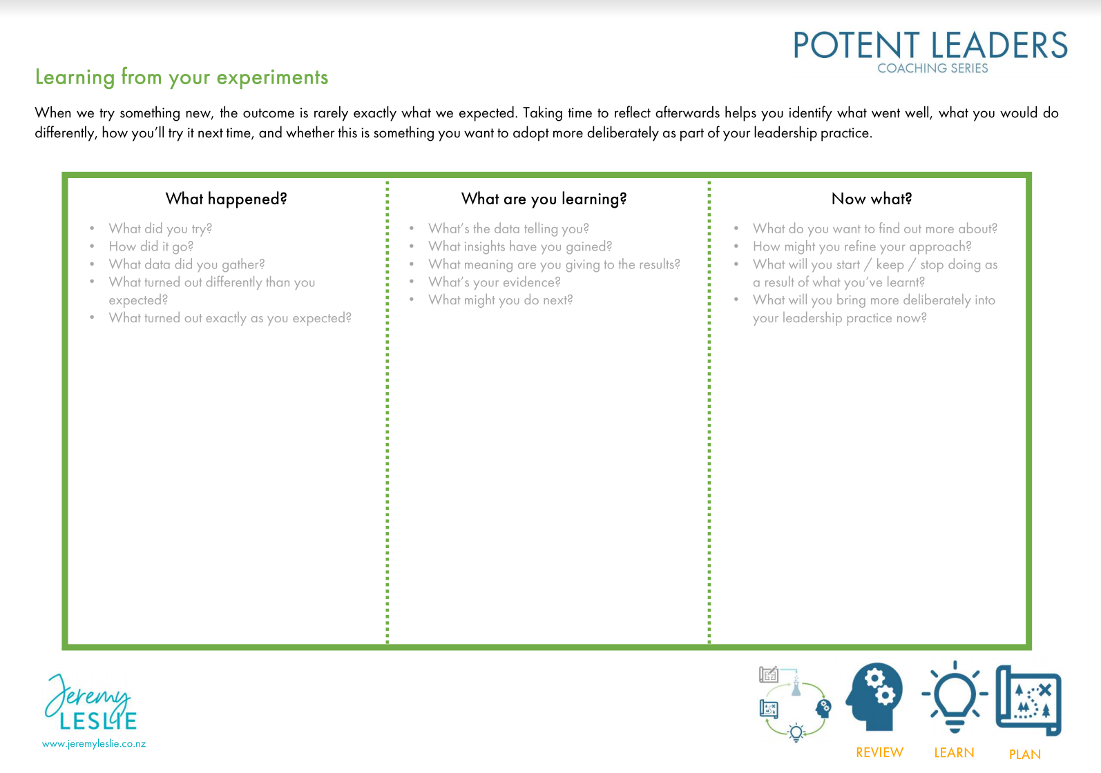 This experiment is all about you working with your people to set a goal they’ll start making progress on. Choose something fairly achievable first up, then stretch out from there in repeated, future goal conversations.